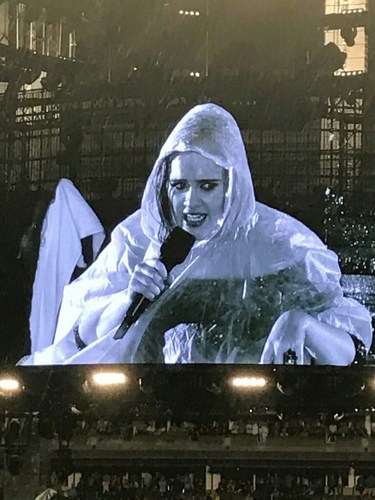 Adele laughed about being caught in the rain and addressed the crowd "You poor things," she said. "It's really raining isn't it."