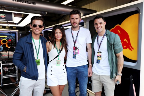 The trio, who were accompanied by Tomlinson's girlfriend Danielle Campbell, posed for pictures together outside of Red Bull's garage.