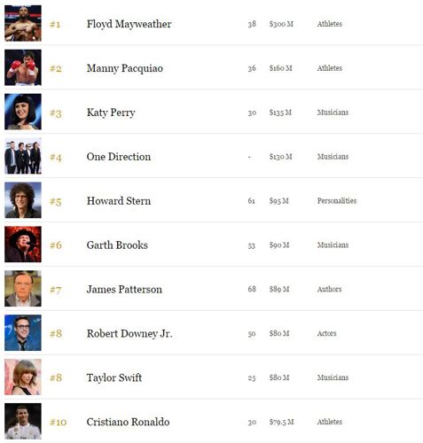 Forbes has released its annual 100 Highest-Paid Celebrities list and the Katy Perry came in third behind Floyd Mayweather and Manny Pacquiao to be the top-earning woman with $135 million.Â