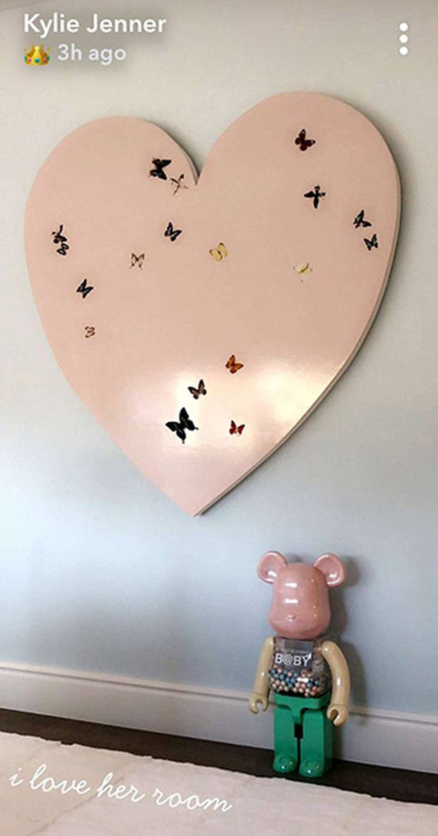 The 20-year-old star took to her Snapchat account to reveal part of her four-week-old baby Stormi's bedroom, which features a huge pink heart accompanied with beautiful multi-coloured butterflies.