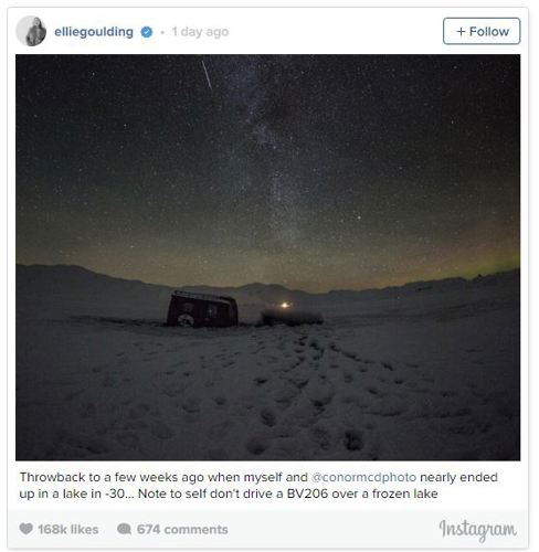 Goulding later shared the same image on her Instagram page, and captioned it, "Throwback to a few weeks ago when myself and @conormcdphoto nearly ended up in a lake in -30... Note to self don't drive a BV206 over a frozen lake".
