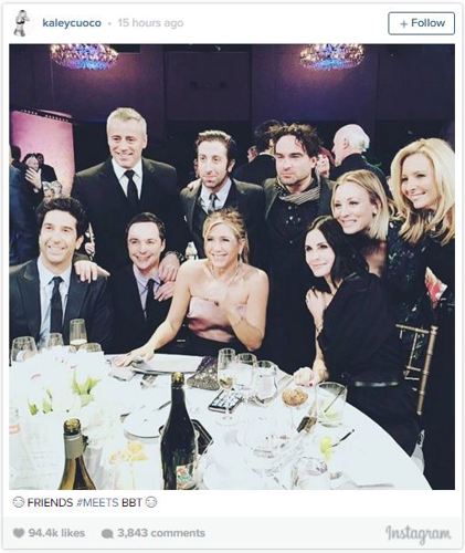 Big Bang Theory star Kaley Cuoco uploaded a snap to her Instagram showing Jennifer Aniston, Courteney Cox, Lisa Kudrow, Matt LeBlanc and David Schwimmer together again alongside the caption: 'Ummmm NIGHT MADE. Can't breathe #friends meets #bbt @bigbangtheory_cbs I died and went to heaven.'