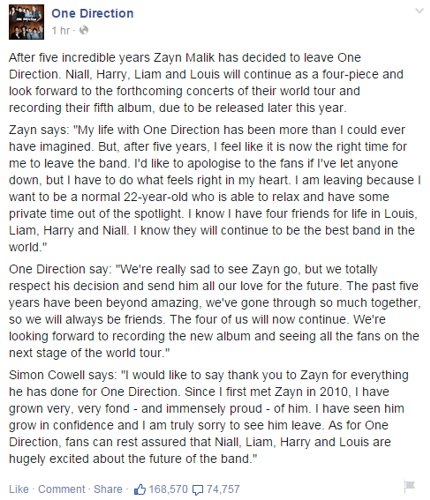 The One Direction boys have confirmed that Zayn Malik has left the band! They posted the below comment to their fans on Facebook breaking the official news that Zayn has left.Â