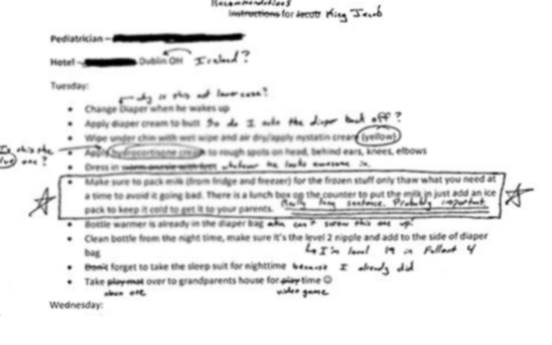 Dad Adds Hilarious Annotations To Wife’s Instructions For Caring For Their Baby