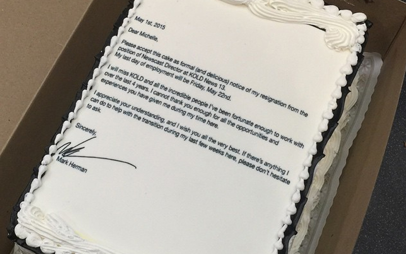 Newscast director at the Arizona CBS affiliate KOLD just made the best resignation announcement! He broke the news that he was leaving by getting his letter of resignation printed on the top of a tasty cake.