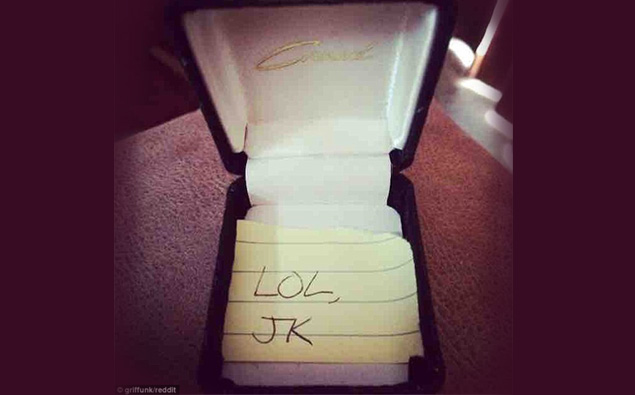 When she opened it, instead of the engagement ring she had hoped for, inside of it was a note saying 'lol, jk' - shorthand for laugh out loud, just kidding.