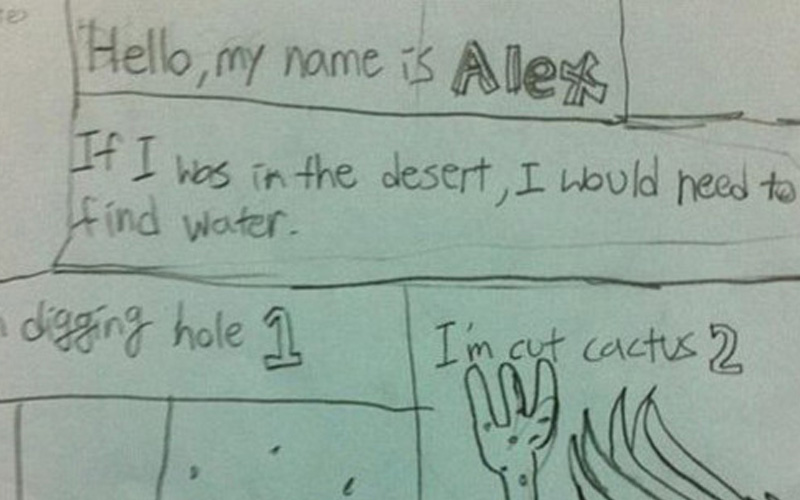 As part of a "creative thinking" project that asked students to come up with survival skills, Alex draws himself digging a hole, cutting down a cactus then using it as a receptacle to drink from.