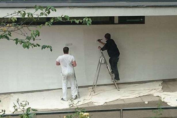 "They had a bit of a long chat between them then he put his bag down and picked up a paintbrush and got to it," said Darren Wheatcroft, who sent pictures in to the Manchester Evening News.