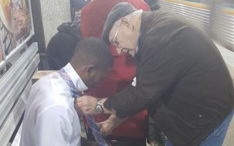 : [HUMANS & HUMANITY]The young guy sitting down was struggling with his tie. The woman in the red coat noticed, and...