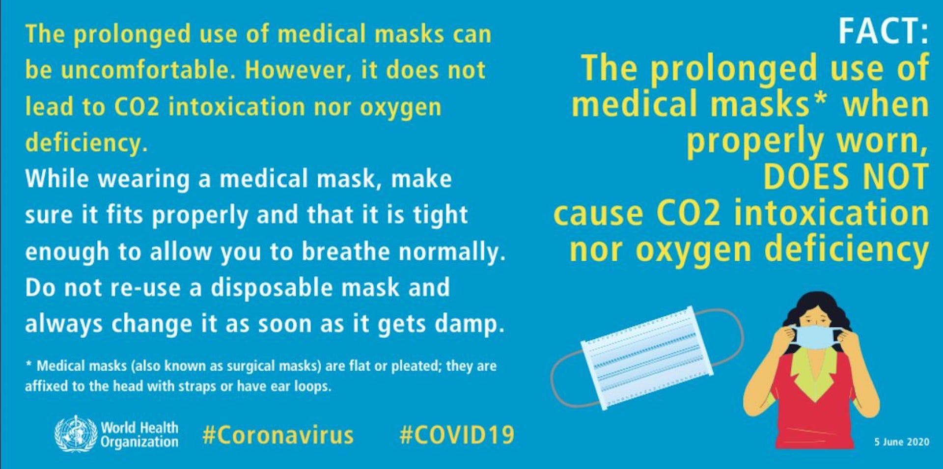 Fortunately, the World Health Organisation and others say there is no evidence a face mask will cause either a drop in blood oxygen or an increase in blood carbon dioxide levels for normal everyday activities.